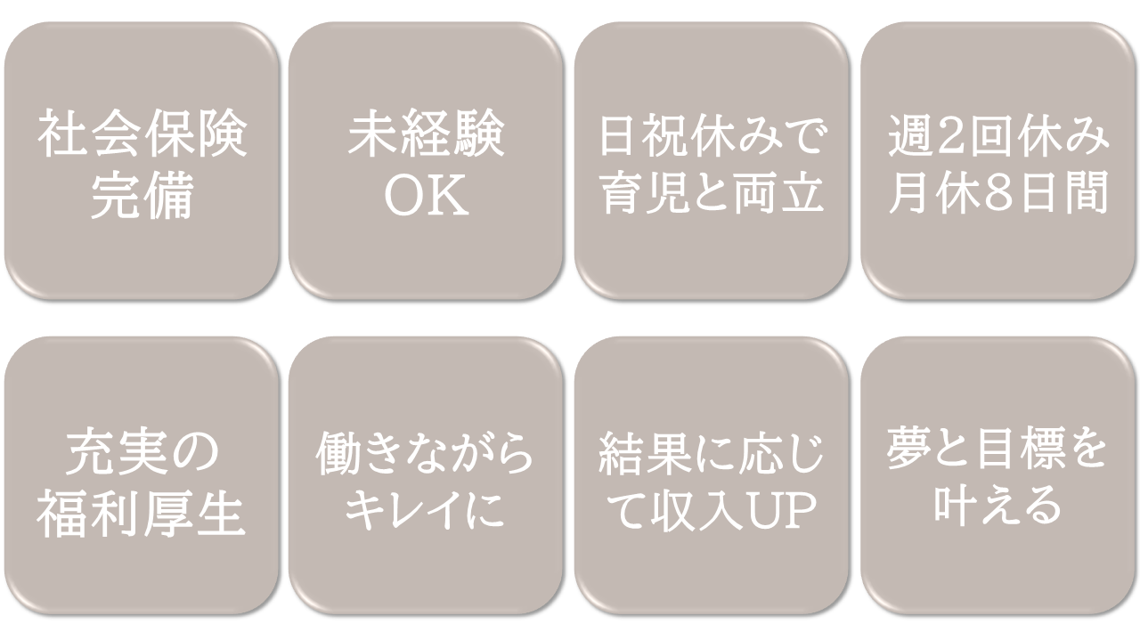 | 待遇 | ◆社会保険完備 ◆福利厚生 ◆年次昇給あり ◆各リーダー手当 ◆美容ケアサポート |